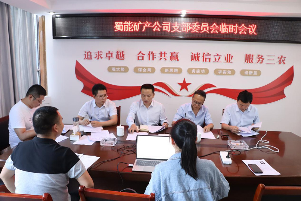? ? ? ? 6月8日,中共四川蜀能礦產(chǎn)有限責(zé)任公司支部委員會(huì)召開(kāi)臨時(shí)會(huì)議,會(huì)議由支部書(shū)記、董事長(zhǎng)、總經(jīng)理徐開(kāi)貴主持。會(huì)議研究公司《中層干部人事任免及國(guó)企改革三年行動(dòng)》等議題。公司支委會(huì)成員出席會(huì)議,非黨員領(lǐng)導(dǎo)及相關(guān)人員列席有關(guān)議題。